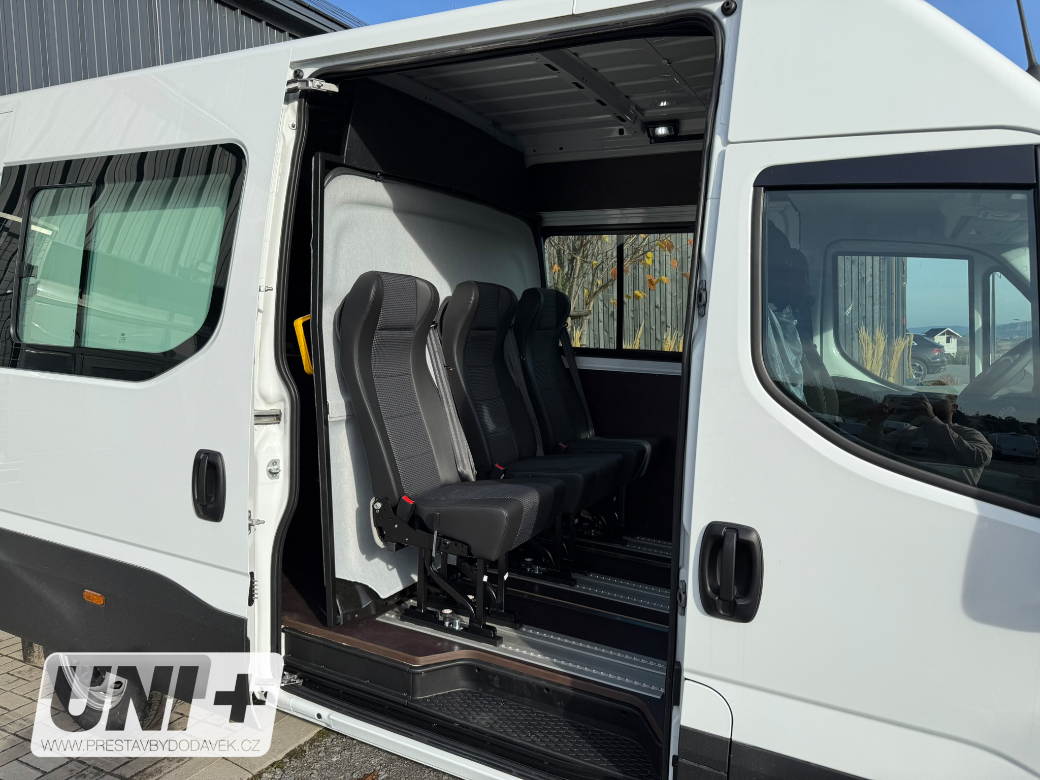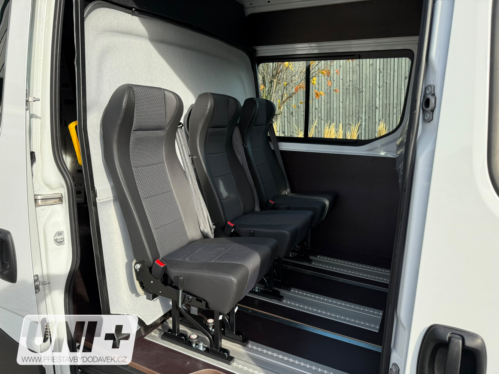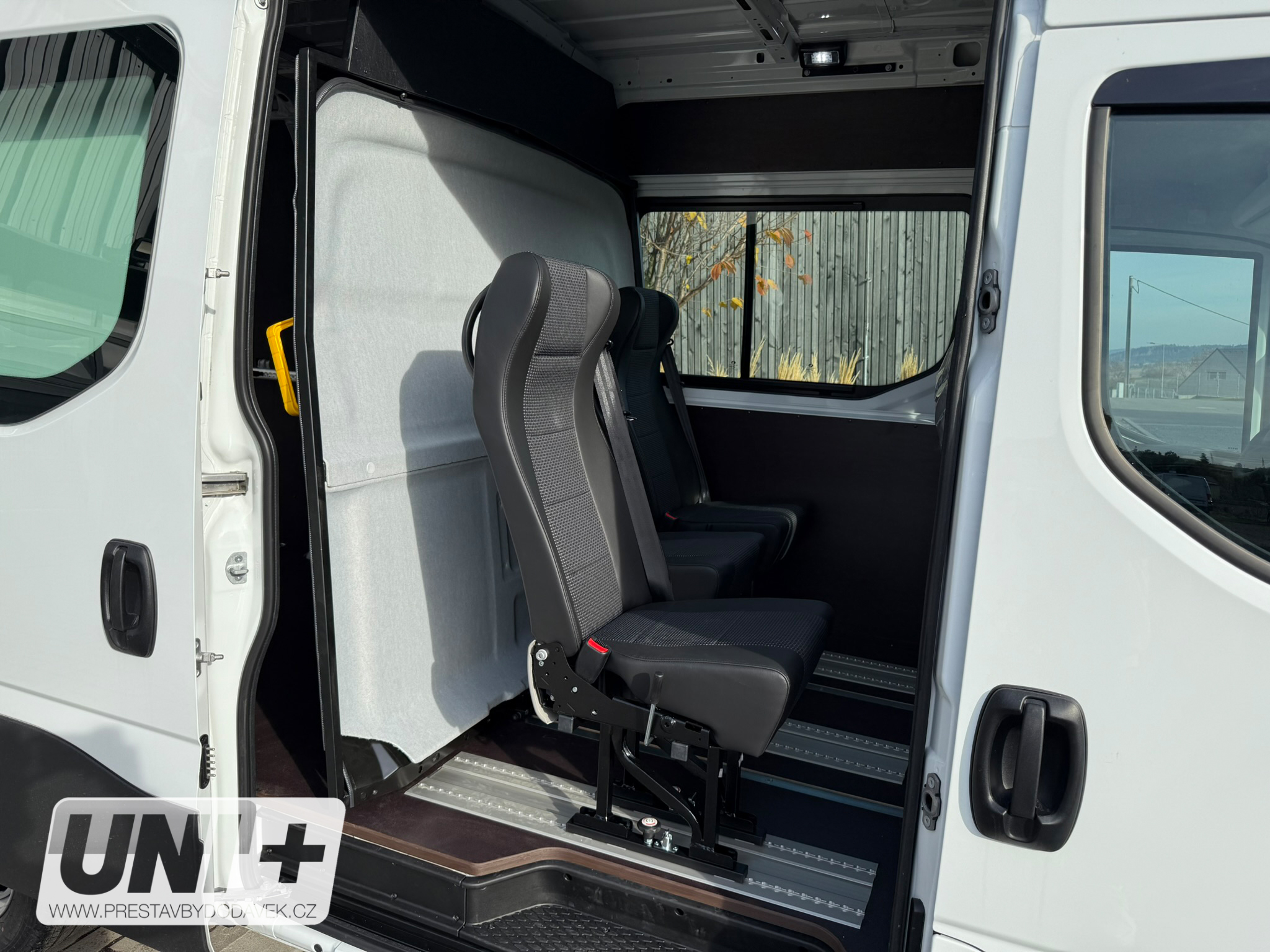 Vůz Iveco Daily Van byl přestavěn na variabilní crewcab s důrazem na flexibilitu a komfort: 🚪 Prosklení: Instalace dvou posuvných oken pro lepší světelnost a ventilaci prostoru. 🪑 Sedadla: Přidány 3 sedadla Novis bez loketních opěrek, usazená do railové dvoulišty umožňující: Posuv v podélném směru Možnost úplného vyjmutí 🧱 Posuvná stěna: Vybavení vozidla posuvnou a aretovatelnou přepážkou za kabinou pro oddělení prostoru. 🚐 Kapacita: Celkový počet míst k sezení je 6 (včetně řidiče). 🔄 Variabilita: Přestavba umožňuje snadnou změnu konfigurace interiéru podle aktuálních potřeb – od přepravy osob po náklad.