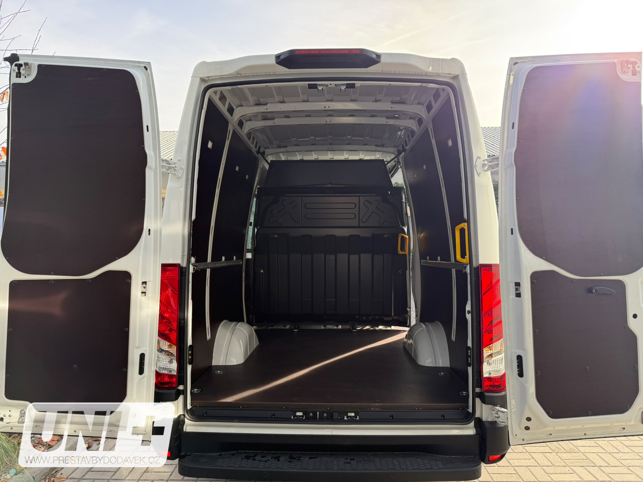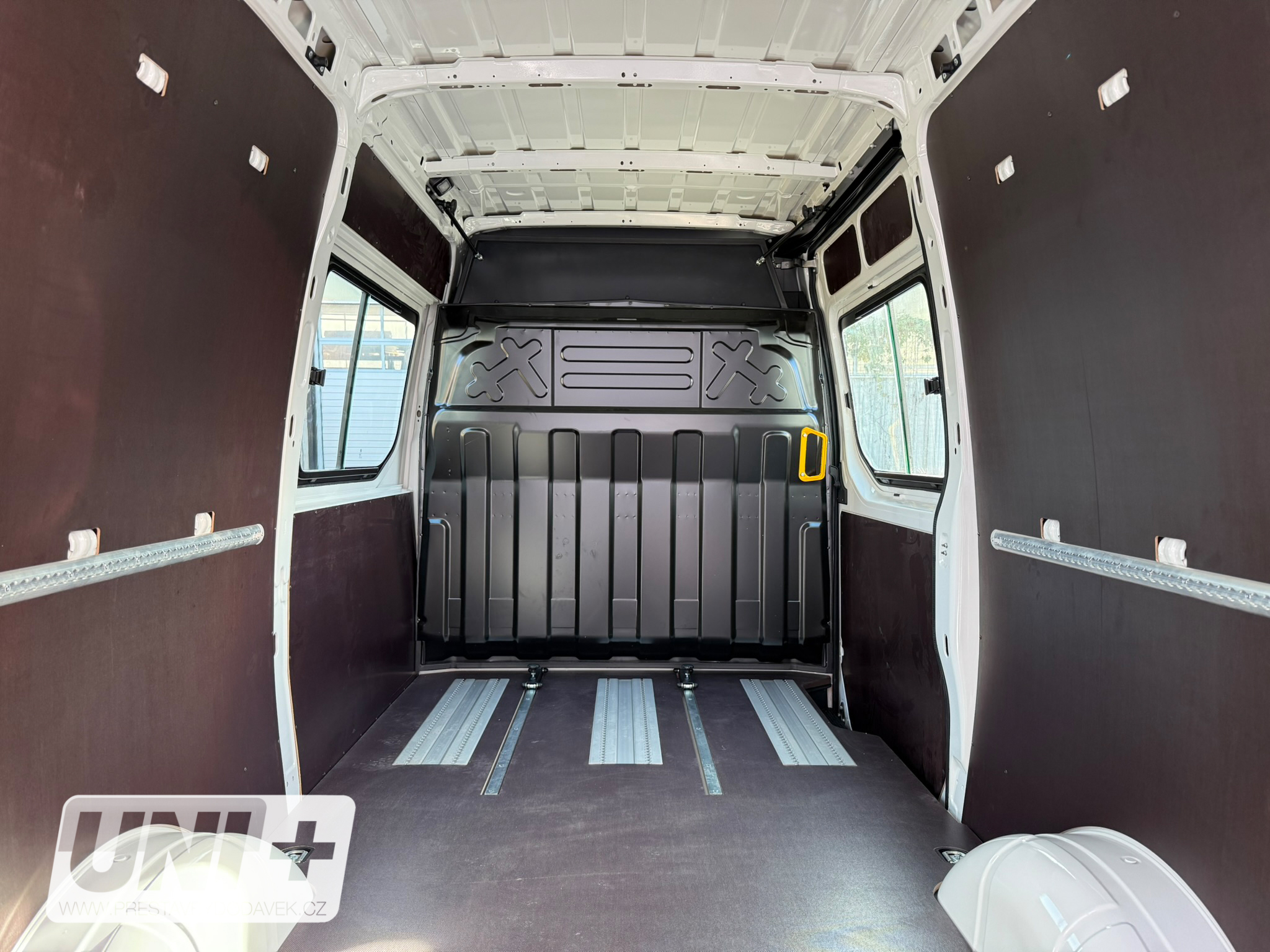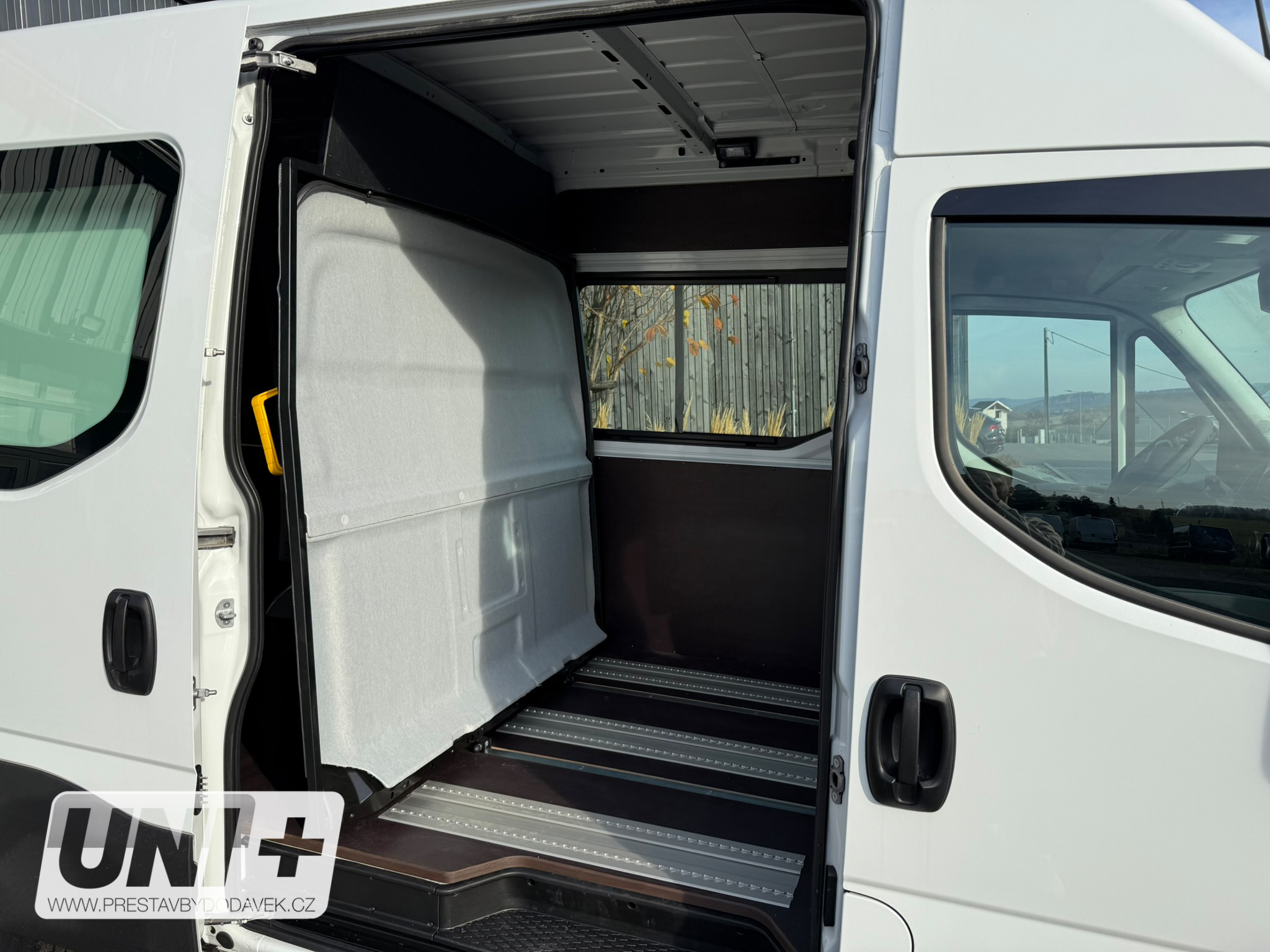 Vůz Iveco Daily Van byl přestavěn na variabilní crewcab s důrazem na flexibilitu a komfort: 🚪 Prosklení: Instalace dvou posuvných oken pro lepší světelnost a ventilaci prostoru. 🪑 Sedadla: Přidány 3 sedadla Novis bez loketních opěrek, usazená do railové dvoulišty umožňující: Posuv v podélném směru Možnost úplného vyjmutí 🧱 Posuvná stěna: Vybavení vozidla posuvnou a aretovatelnou přepážkou za kabinou pro oddělení prostoru. 🚐 Kapacita: Celkový počet míst k sezení je 6 (včetně řidiče). 🔄 Variabilita: Přestavba umožňuje snadnou změnu konfigurace interiéru podle aktuálních potřeb – od přepravy osob po náklad.