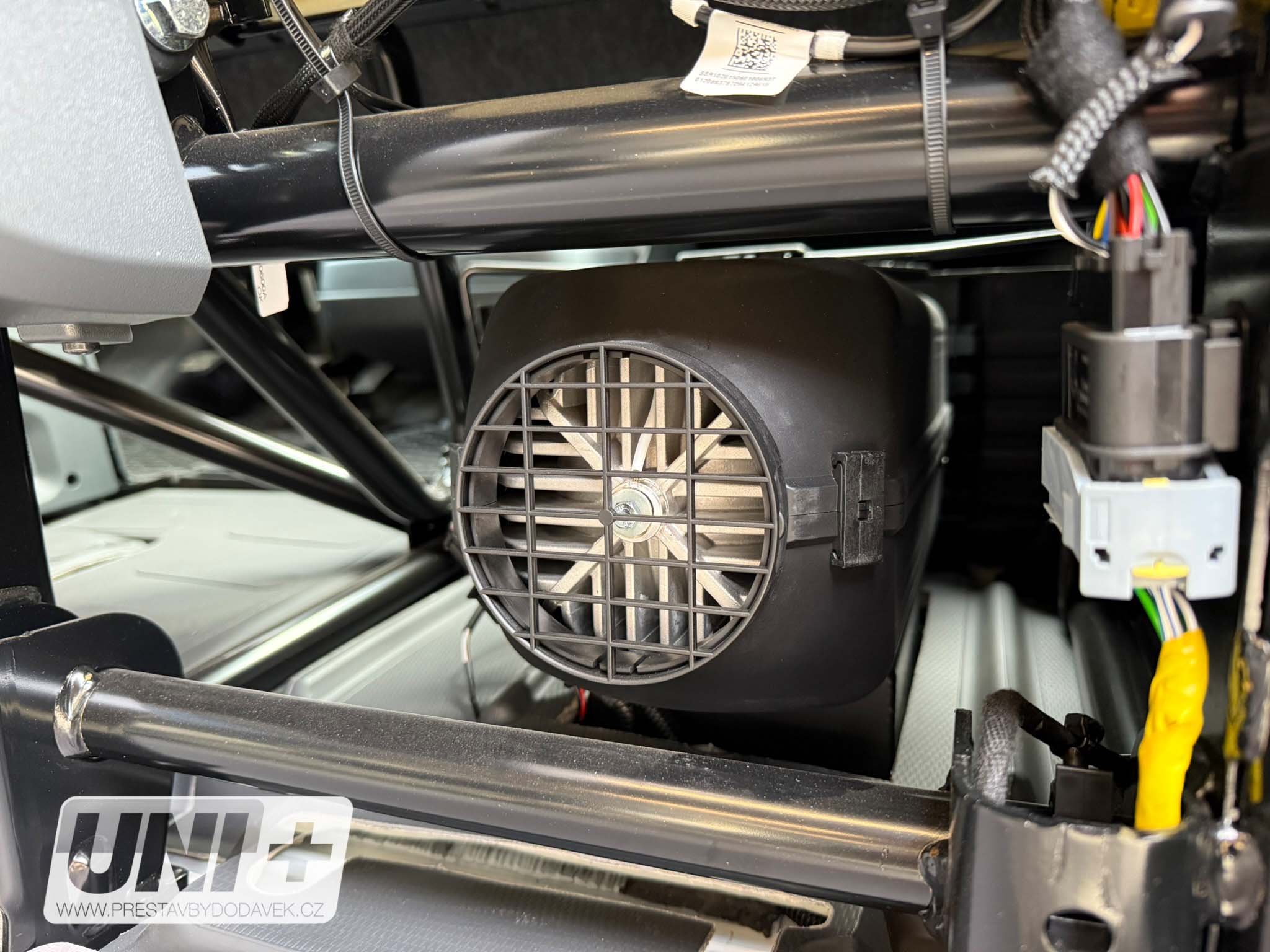 - Montáž oken: Dodatečné boční okna zajišťují světlo a výhled pro cestující v zadní části.